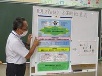 3年生は、8月31日に2回目の進路説明会を実施しました。今回の進路説明会には3校の高等学校の先生に来校いただき、それぞれの学校に関する説明をしてもらいました。今回の説明会には、希望する3年生の保護者の皆様にも参加いただき、生徒とともに話を聴いてもらいました。