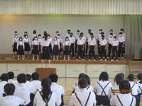 27日(月)は、全校朝会でした。校長先生からは、修学旅行や校外学習における生徒たちの成果についてと熱中症対策についてなどの話がありました。続いて、生徒会からの話と表彰式を行いました。