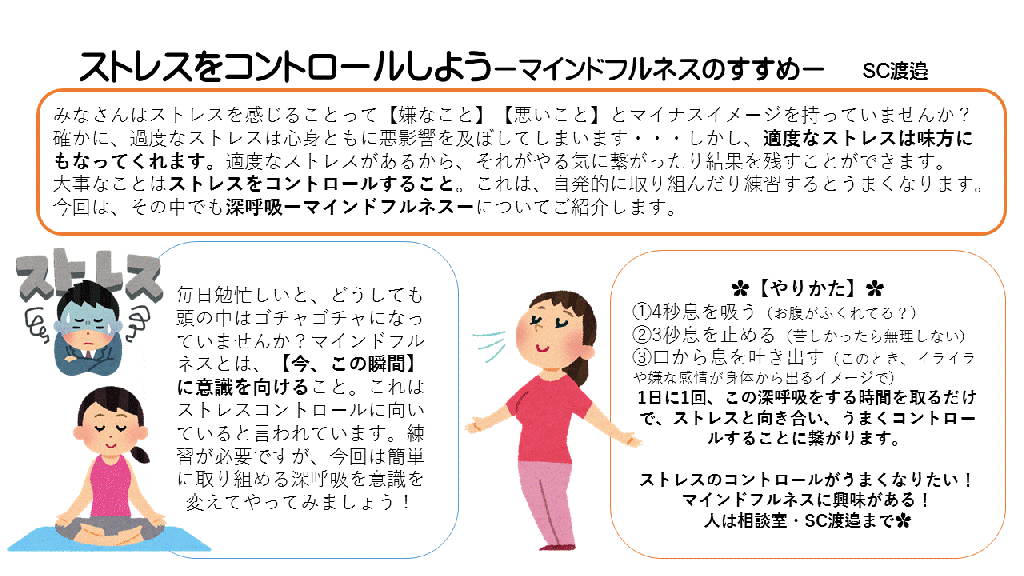 スクールカウンセラーの先生から、「ストレスをコントロールしよう~マインドフルネスのすすめ~」というSCだよりをいただきました。是非、皆様下のSCだよりを読まれて、『深呼吸』を実践されてください!