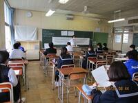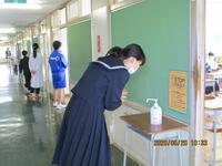 今週は、月曜日に3年生、火曜日に2年生、水曜日に1年生が学年を半分に分けて分散登校を実施しました。感染症対策として、学活の最初には生徒が持参した健康観察書を基に健康状態を確認し、その後生徒同士の間隔をあけて行動させたり、消毒液を使いやすいところに置いておき、こまめに消毒するように声かけを行いました。