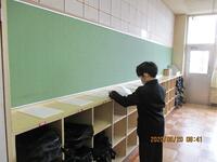 一段目中:消毒しながら掲示物を読んでいる生徒の様子