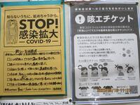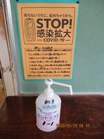二段目左:廊下に掲示してある感染防止の紙と消毒液