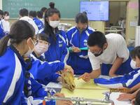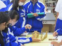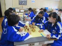 1年生は、理科で「動物の特徴と分類」という単元を行っています。その単元の中で、『雑食動物の頭骨を観察し、顔のつくりと生活の関連を考える』という授業があり、理科の先生がわざわざ神奈川県立生命の星・地球博物館まで行き、日本ザルやイノシシなどの頭骨を借り、それを活用して授業を行いました。この頭骨を熱心に観察し、自らの考えを交流している生徒たちの姿を見ていると、先生がわざわざ小田原市入生田まで行き、頭骨を借りてきたかいがあったと思いました。