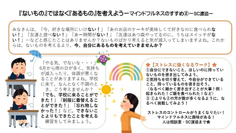 スクールカウンセラーだより「『ないもの』ではなく『あるもの』を考えよう~マインドフルネスのすすめ②~」を掲載しましたので、どうぞご覧下さい。