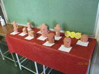 相模級の教室前に、生徒が作った作品を展示しています。作品は、美術の時間に粘土で作った「埴輪」と綺麗に色を塗った「グラジュエーションの板」です。一つ一つの作品を見てみると、生徒が丁寧に色を塗ったことがよく分かります。