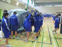 座間市役所の危機管理課の方々に来校いただき、防災講演会を1年生が開催しました。災害が起こった際には、生徒たちが地域の方々の役に立てるように、ここ数年色々な学習を積んでいます。今回は、1年生が災害が起こった際の対応として、簡易テントの設営について実際に行いました。初めて簡易テントを組み立てたので、組み立てには時間がかかった班もありましたが、最終的には見事全ての班が組み立てを終えることができました。