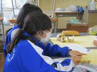 1年生は、理科で「動物の特徴と分類」という単元を行っています。その単元の中で、『雑食動物の頭骨を観察し、顔のつくりと生活の関連を考える』という授業があり、理科の先生がわざわざ神奈川県立生命の星・地球博物館まで行き日本ザルやイノシシなどの頭骨を借り、それを活用して授業を行いました。この頭骨を熱心に観察し、自らの考えを交流している生徒たちの姿を見ていると、先生がわざわざ小田原市入生田まで行き、頭骨を借りてきたかいがあったと思いました。