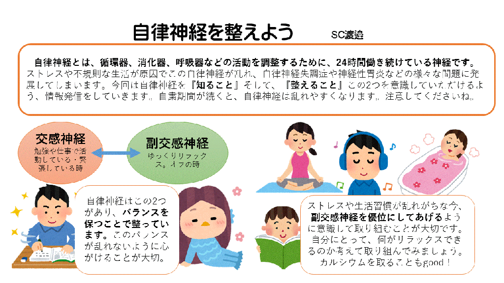 スクールカウンセラーの先生より、『自立神経を整えよう』という「SCだより」をいただきましたので、掲載します。ご覧ください。
